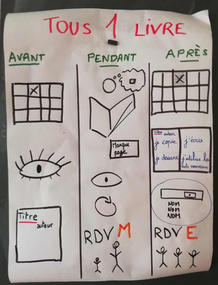 Chaque élève a un livre pour lire seul, un marque-page avec le vocabulaire, un cahier pour faire un souvenir du livre, une recette pour réussir l’atelier, et il va aussi en RDV pour être accompagné dans sa compréhension de l’histoire. Il reste avec le même livre pendant 6 à 8 séances.